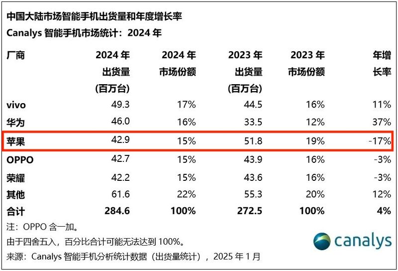 另一边,开店也挡不住销量下滑。1月16日,市场研究公司Canaly公布了2024年中国智能手机出货量数据,第四季度苹果在中国的出货量下降了25%,整个2024年,苹果出货量下滑了17%,是前五大厂商中下滑幅度最大的品牌。