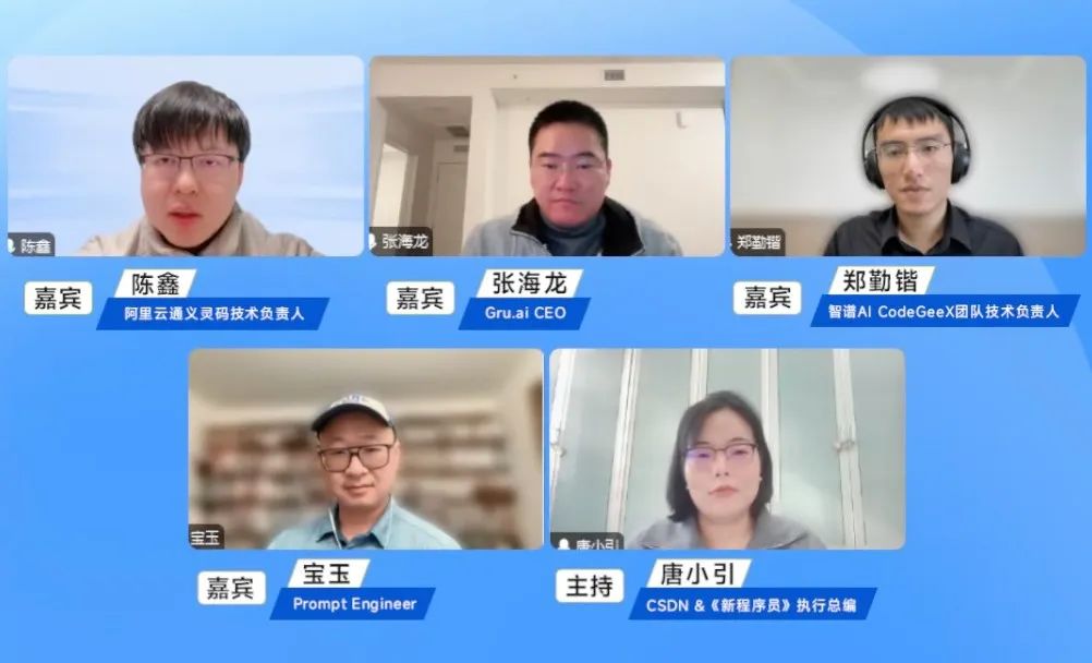 1 月 15 日,CSDN 对话直播栏目《万有引力》迎来第二期。在栏目主理人 CSDN &《新程序员》执行总编唐小引的主持下,Gru.ai CEO 张海龙、知名 Prompt Engineer 宝玉、阿里云通义灵码技术负责人 陈鑫,以及智谱 AI CodeGeeX 团队技术负责人 郑勤锴围绕程序员们最为关心的 AI 编程一起展开深入对谈。