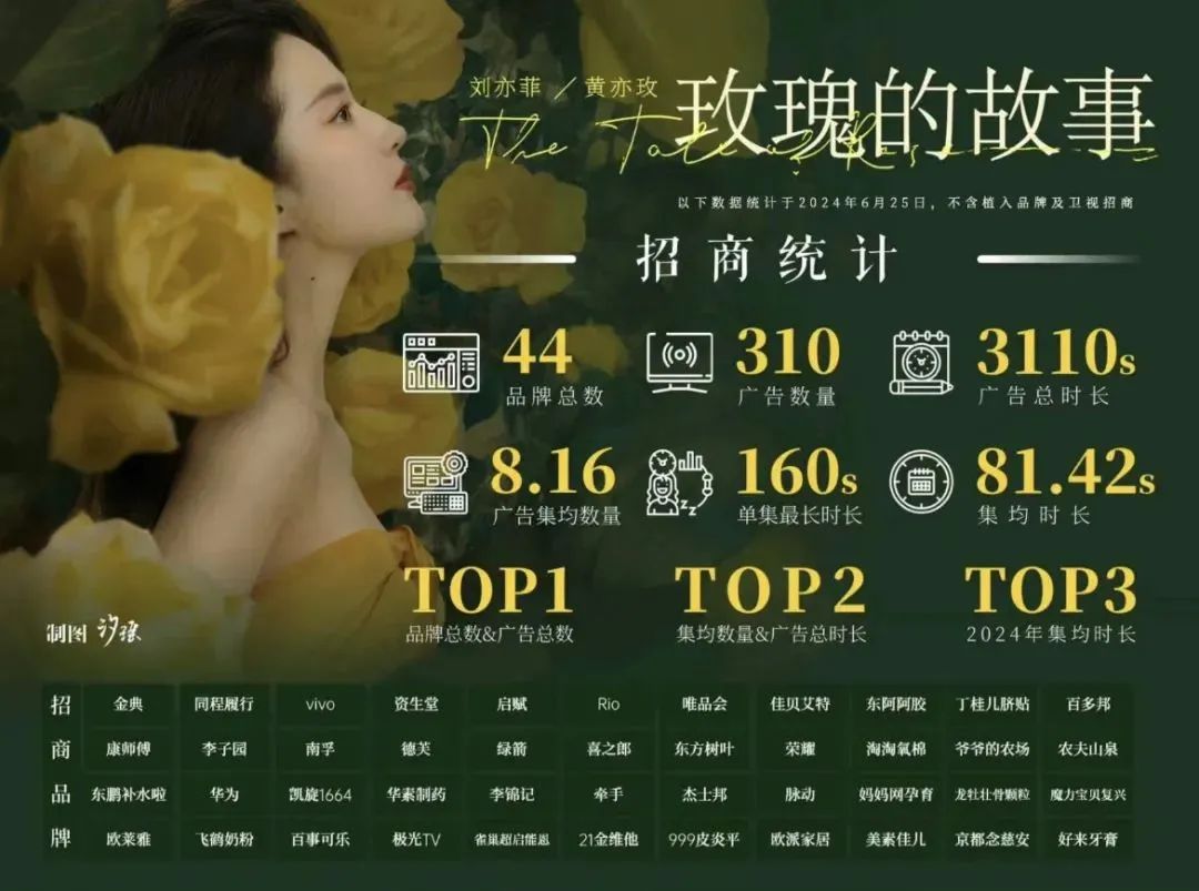 根据豆瓣网友@来看月统计,截止到2024年10月28日,总广告数最多的剧集是《玫瑰的故事》,数量为310,总时长最长的为4243秒的《庆余年2》,而集均时长和合作品牌数量最多的分别为117.8秒的《庆余年2》和有44个合作品牌的《玫瑰的故事》。