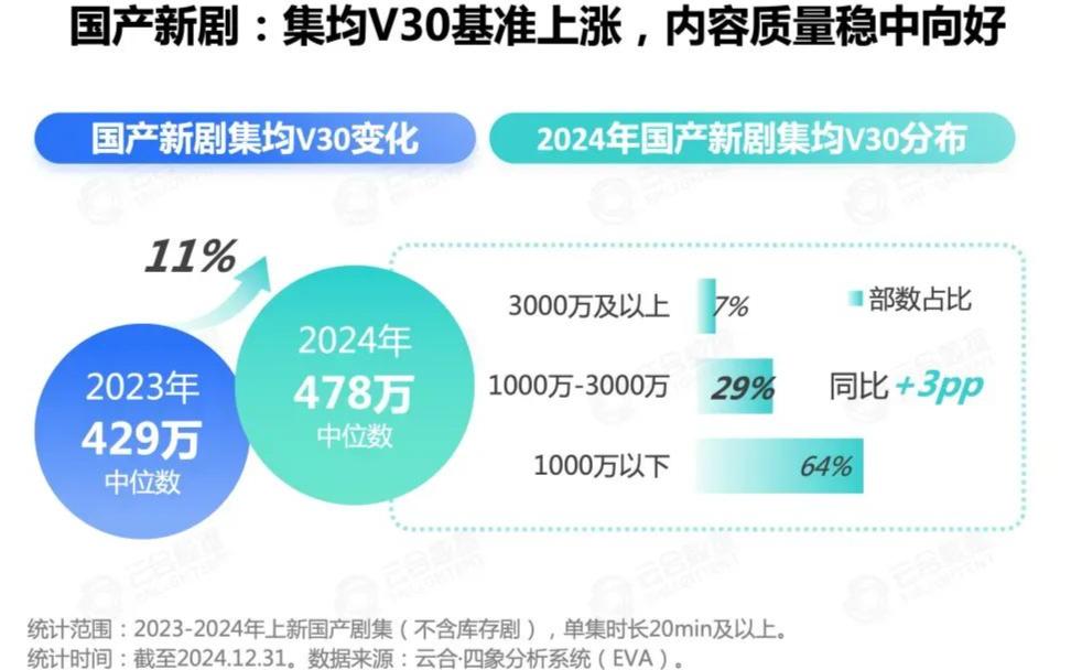一定程度上,商业向好离不开剧集市场地整体表现。虽然2024年并没有出现如前两年《人世间》《狂飙》一般的全民爆款,但根据云合数据显示,2024年上新剧集集均30天有效播放中位数为478万,同比上涨11%。