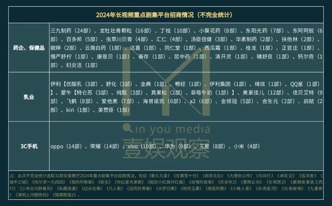 壹娱观察(ID:yiyuguancha) 汇总了32部优爱腾芒2024年头部、热播剧的大致广告情况(不含剧中剧情植入),从大类来看,药企、饮料、零食、互联网、保健品、母婴、3C、交通出行、家具、美妆护肤、个护清洁等多种行业类型都没有错过剧集赞助,而其中药企、保健品、3C、乳制品的身影又更为常见。