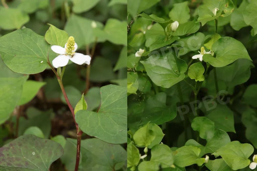 除了常见的折耳根(左)外,在四川峨眉山区域,还分布着一种峨眉蕺菜(Houttuynia emeiensis),其习性和特点与折耳根类似,最大的区别是它全身都是绿色,不会有紫色的茎叶(图片来源:Wikimedia Commons & 李策宏@PPBC)