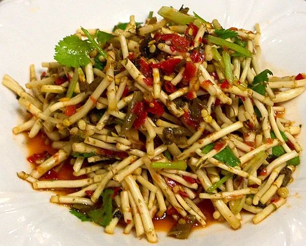 在两汉时期,由于气候相对温暖,在黄河流域折耳根也非常常见,它也逐渐从一种野菜变成了有人专门栽种的蔬菜。在中原一带,折耳根被称为“蒩(zū)”,河南汝州的折耳根甚至作为贡品进献皇帝。魏晋时期对于折耳根的记载非常多,所涉及的范围也非常广。《齐民要术》里就有“蕺葅法”的记载,这说明当时黄河中下游一带的某些地方仍然食用折耳根。而在西晋《风土记》中,已经有了“蜀人所谓蒩香也”,说明四川人对于折耳根的喜爱从那时候就开始了。在当时出现了生食、酿制酱菜、制作饮料等多种吃法,也已经和今天差不多了。