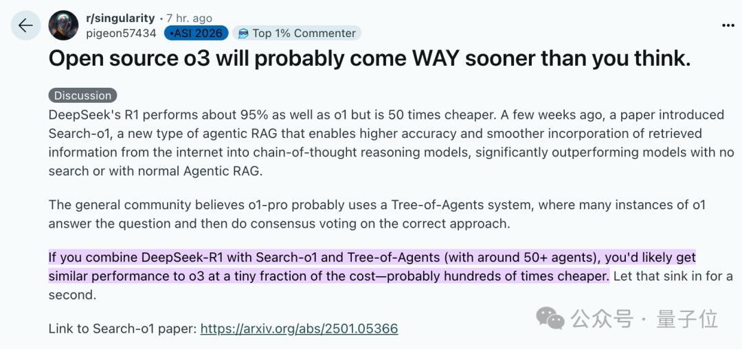 如果将DeepSeek-R1与Search-o1和Tree-of-Agents(大约50个智能体)结合起来,可以很小的成本获得与o3类似的性能,最终可能便宜数百倍。