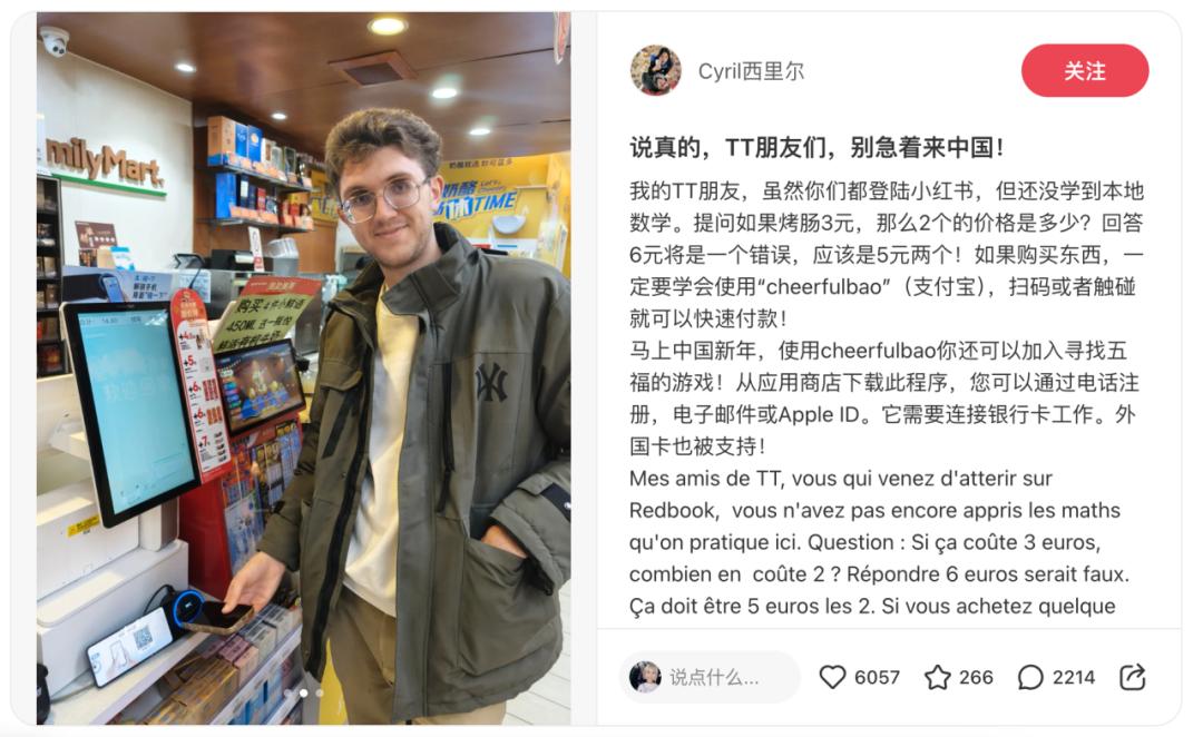 支付宝也意识到了这一点,因此在与生活在上海的小红书博主Cyril西里尔的合作中,内容重点没有继续放在向海外用户普及支付宝的使用方式上,而是面向国内消费者,加码推广支付宝“碰一碰”功能和新上线的春节集五福活动,同样收获了不错的成效。