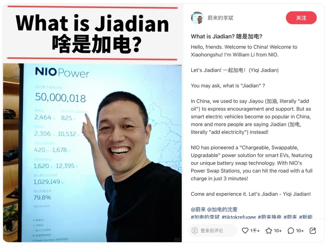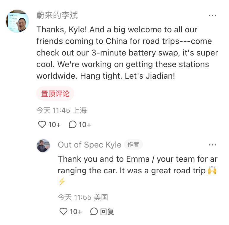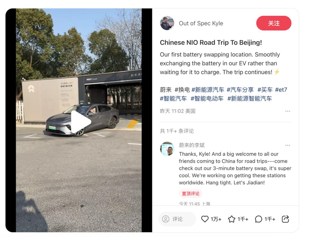 随即,在 YouTube 上拥有 25.6 万订阅者的美国知名汽车博主 Out of Spec Kyle 发布小红书笔记称已经来到中国,即将在接下来的几天内驾驶两台蔚来汽车完成从上海到北京的行程,并将随时更新路上的见闻。其中一条记录换电全过程的笔记在小红书上获得了 3.6 万个赞以及 6545 条评论。李斌在评论区表示了欢迎,并提到蔚来正在全世界各地修建换电站。