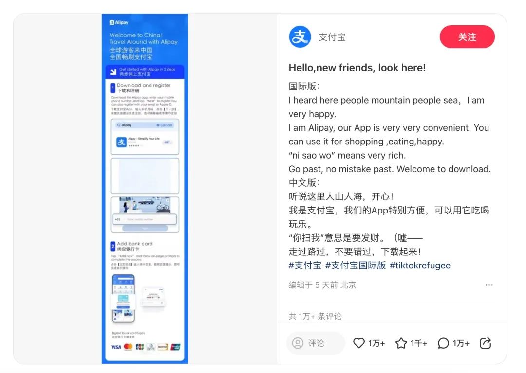 1 月 15 日,支付宝官方就立刻整理出了一套双语版本文案,详细介绍了支付宝的主要使用场景、下载方式、注册流程、绑定银行卡教程等。目前已经收获了 2.3 万个赞,3831 个收藏以及 1.5 万条评论。