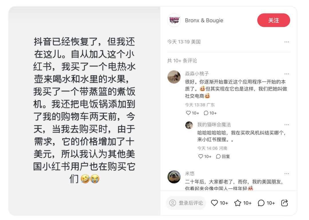经历短暂关停后,TikTok 本周恢复了在美服务,但“TT难民”们却表示有点不想走了,因为他们已经找到了打开小红书的正确方式——把小红书当作生活的百科全书。