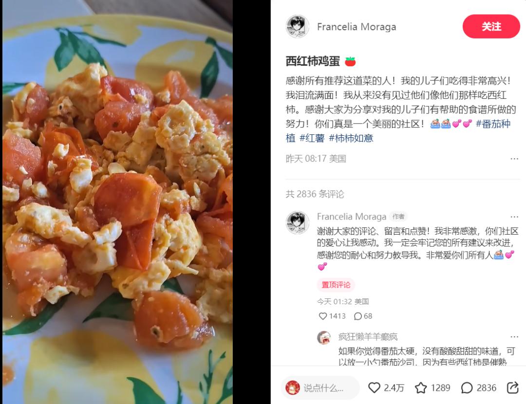 美国用户 Bronx & Bougie 刚来不到一周,就下单了电热水壶和电饭锅,准备开始喝热水养生。在热心肠的小红书“老内”帮助下,来自美国的墨西哥裔用户 Francelia Moraga 学会了做西红柿炒鸡蛋和可乐鸡翅,截至目前,Francelia 的小红书账号已经有了 1.3 万粉丝的关注。