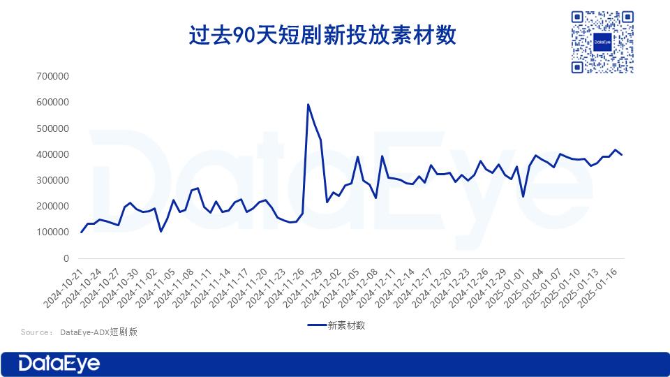 根据 DataEye-ADX 数据,2024 年以来,短剧素材投放量激增,全年累计投放素材量超 4298 万。过去 90 天,短剧日均投放素材量超 20 万组。