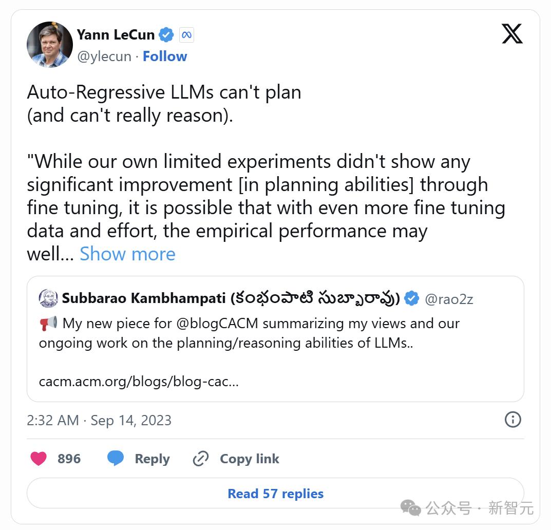 2023年,Meta的首席AI科学家Yann LeCun明确指出,自回归LLM无法做规划。