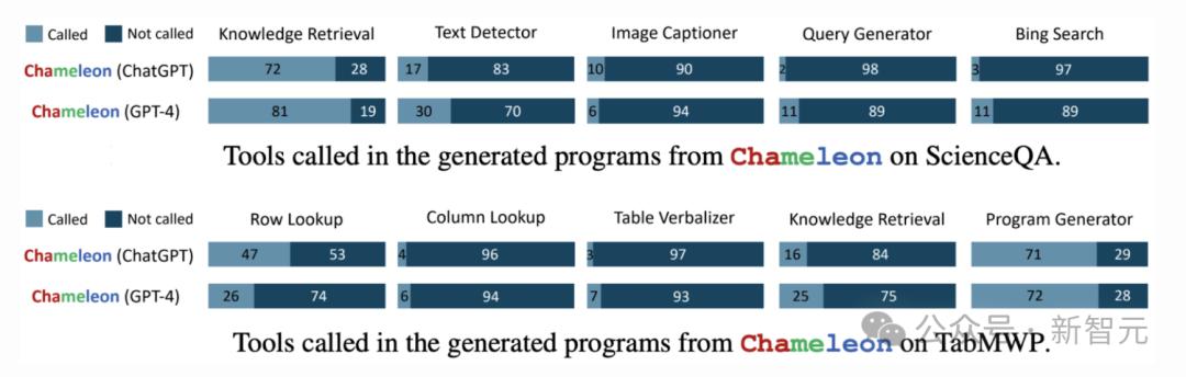 不同模型偏好使用不同的工具。ChatGPT更常使用图像描述工具,而GPT-4更倾向于使用知识检索工具。