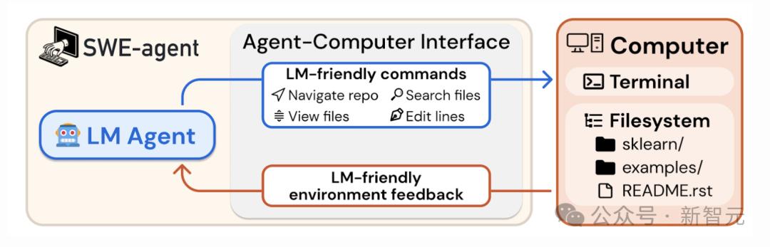 图中呈现的是SWE-agent,这是一个基于GPT-4构建的智能体。它的工作环境是一台配备了终端和文件系统的计算机。它能执行的操作包括在代码仓库中导航、搜索文件、查看与编辑文件。