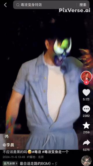 2024年11月1日,我们的毒液特效模版伴随PixVerse V3视频生成模型上线后一夜爆火,许多素人、网红甚至明星李晨都自发用PixVerse做了毒液变身的视频发抖音。这是整个行业内,AI视频大模型第一次被普通人广泛使用并传播。