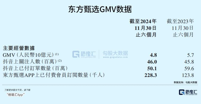 财报显示,尽管东方甄选抖音账号矩阵的抖音上关注人数较2024年5月31日减少1900万至4600万人。但东方甄选App正在逐渐建立自己的品牌效应,来自东方甄选App的GMV占比为13.6%, App付费会员订阅数量同比增长84.41%至22.83万人。