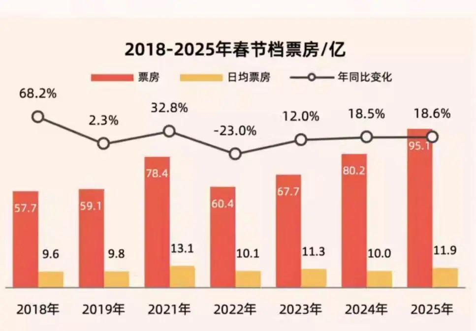 光线传媒成为2025年春节档的最大赢家。据《2025年春节档电影市场洞察报告》,2025年春节档票房为95.1亿元,日均票房11.9亿元,场次348.6万,观影人次1.87亿,上座率43.3%,档期票房、观影人次双双破纪录。