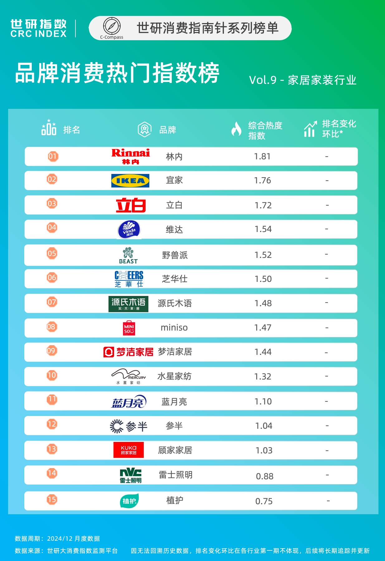 本次监测周期内,林内、宜家、立白以1.81、1.76和1.72的综合热度位列榜单综合热度前三,与后面品牌拉开差距。