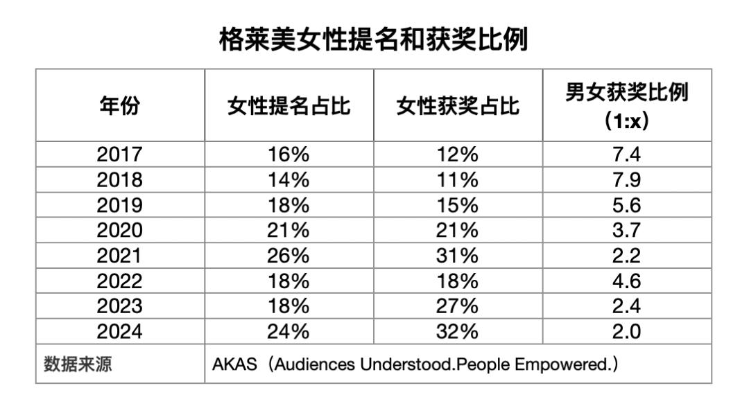 从统计数据上看,过去近年来,女性音乐人在格莱美奖的提名和获奖比例都在不断提高。2020年以前,女性提名和获奖的比例都不到20%,过去三年来,女性音乐人的获奖比例已经提高到30%左右。2024年和2025年都是32%。男女获奖比例从2018年的7.9/1降到了2024年的2/1。