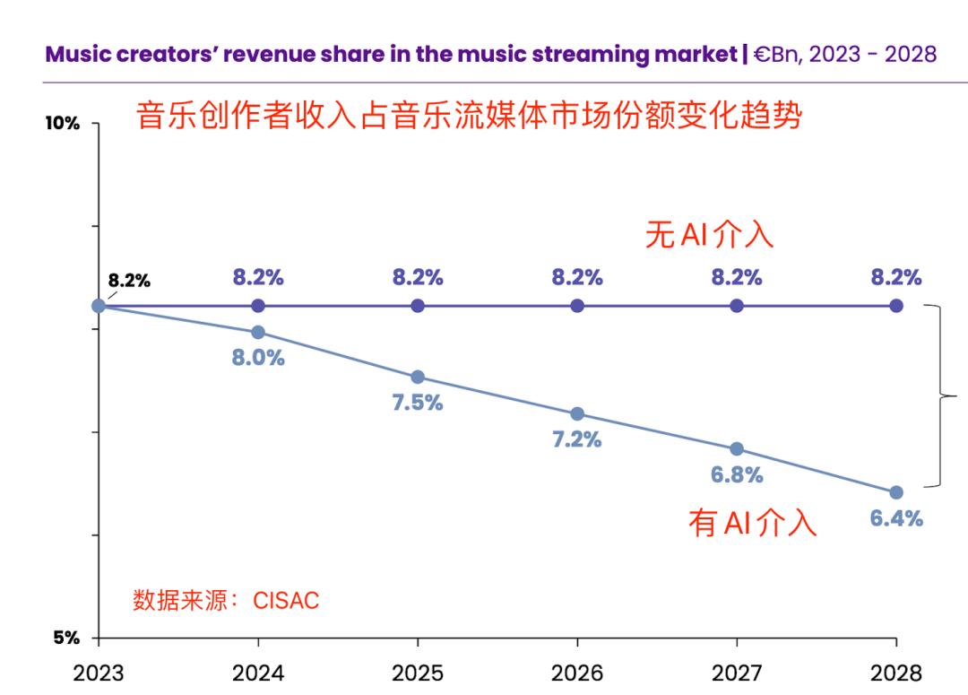 国际作家和作曲家协会联合会早前发布了一份报告,报告预计,到2028年,预计人工智能生成音乐所获得的收入,将占音乐流媒体平台收入的约20%,占B2B音乐库收入的约60%,24%的音乐人将面临失去收入危险。