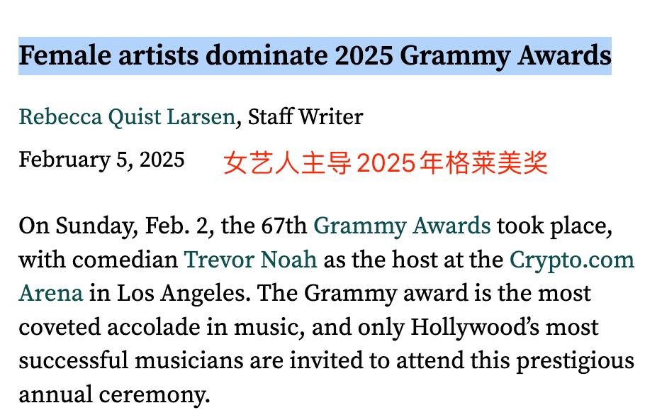 “女艺人主导2025格莱美奖。”这是一些媒体对2025年格莱美奖的总结。