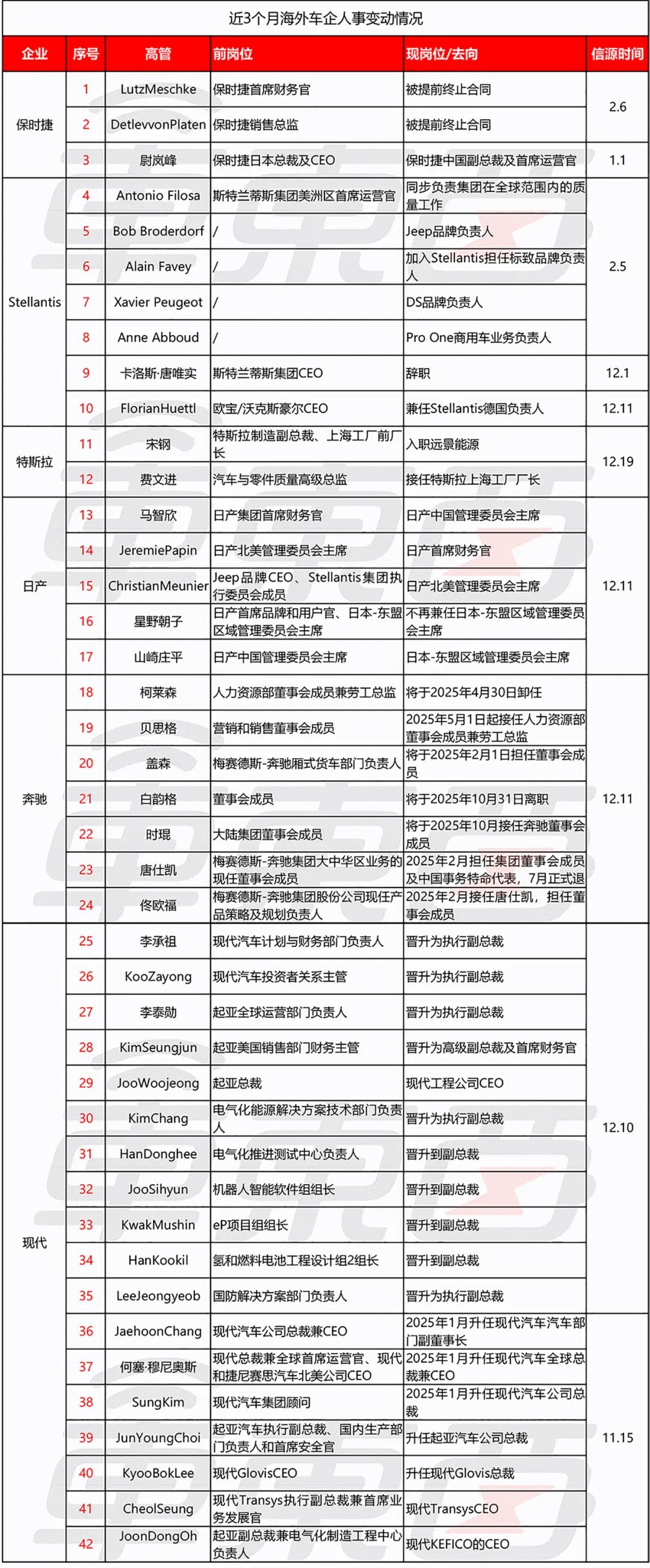 自2024年11月起至2025年2月,车圈持续上演人事大挪移,无论是国有车企、在华合资车企、新势力、亦或是海外车企集团,都掀起了高管换防风暴。