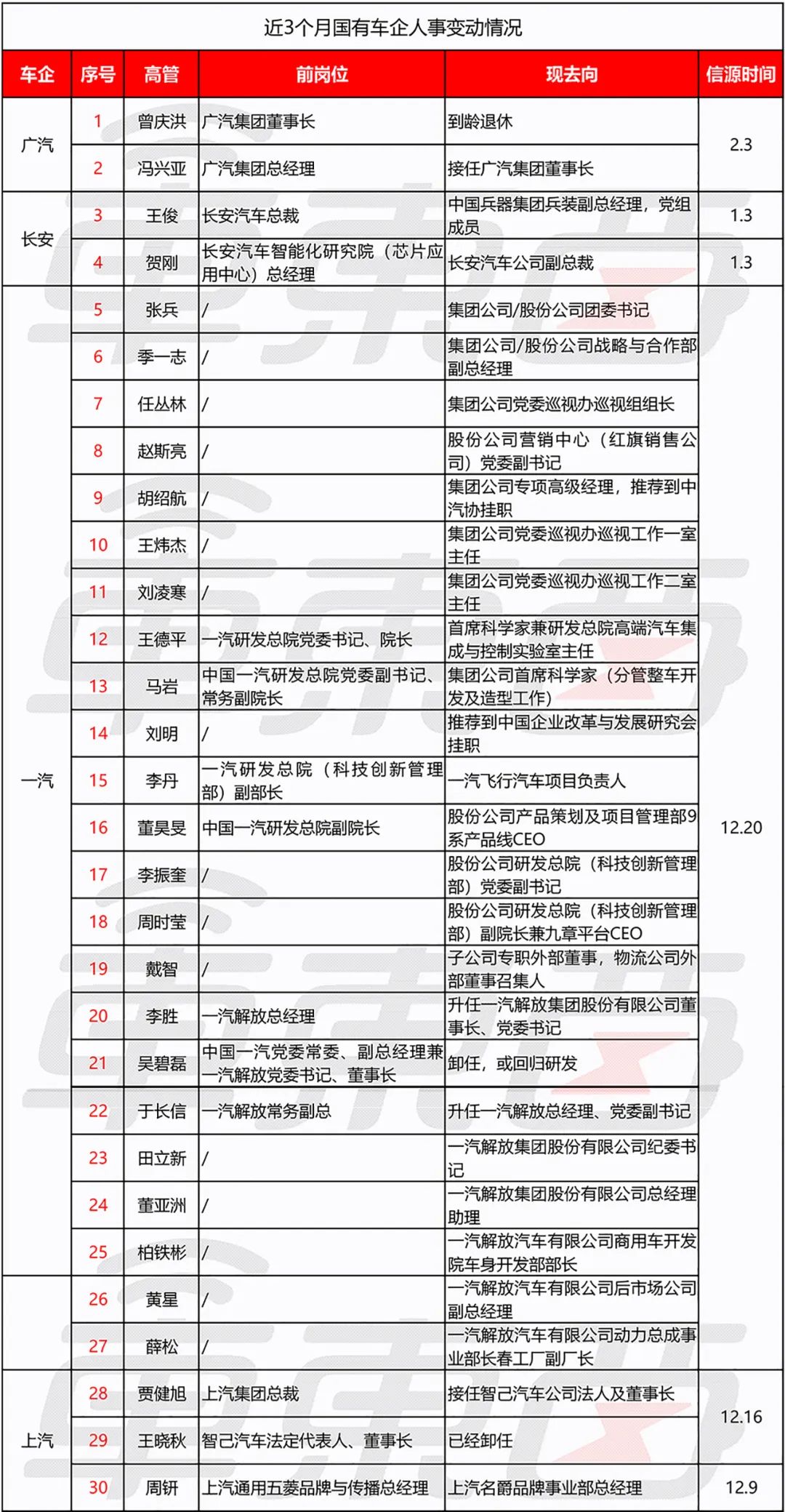 具体来看,刚开年,广汽、长安、一汽、上汽等国有车企就进行了大批高管岗位调整。其中,一汽高管换防最为剧烈。
