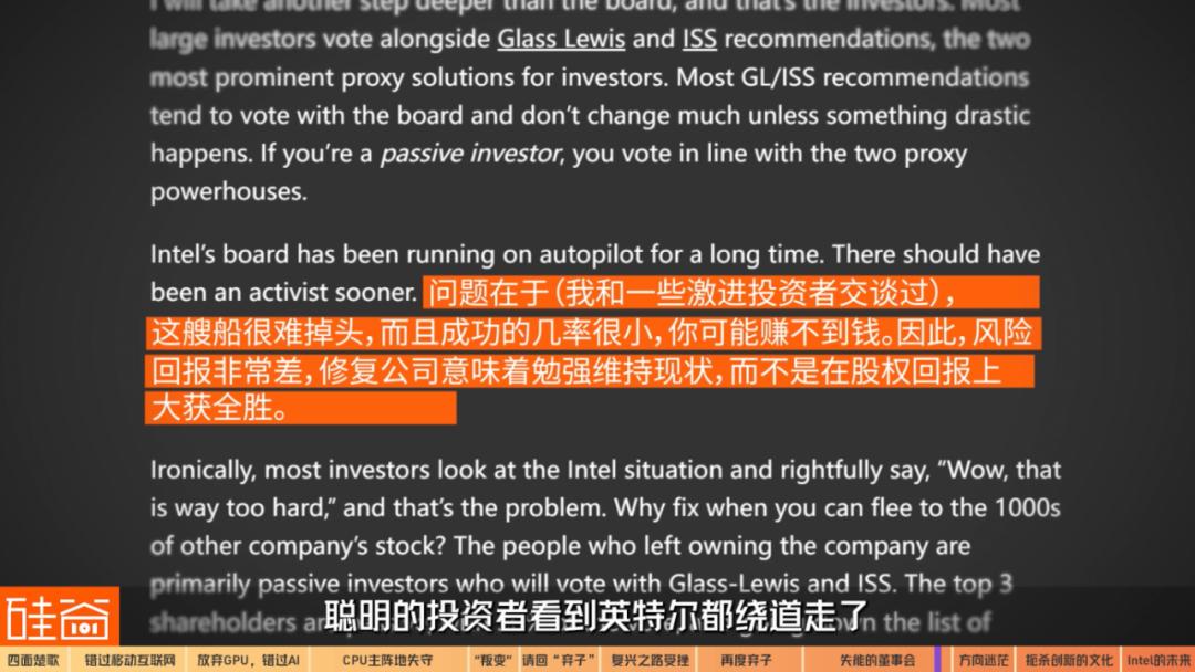 那为什么没有激进投资者进场来改变这家公司呢?Doug O'Laughlin在他的文章中也写道:他与一些激进投资者交谈过,英特尔已经是船大难掉头,投资进场的风险太高。也就是说,聪明的投资者看到英特尔都绕道走了,留下的只有保守派。