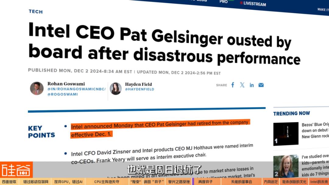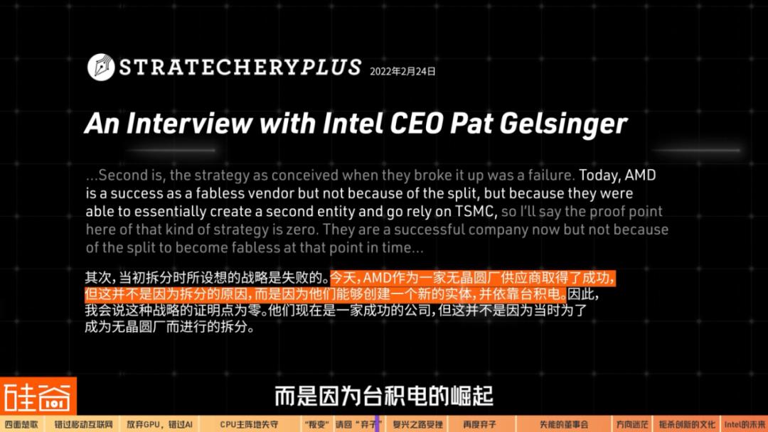 过去三年半英特尔所有发布的产品,没有一个是Pat Gelsinger自己做的,因为硬件周期是5年,过去三年的东西都是前一个CEO做的。所以如果说Pat Gelsinger还不够行、不够好,那是因为什么呢?难道是看到了2025年的18A制程做不出来?还是怎么样?所以我觉得是董事会没有耐心。