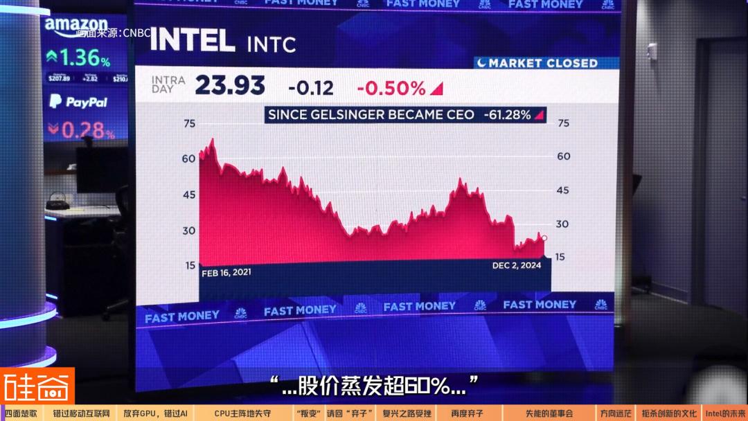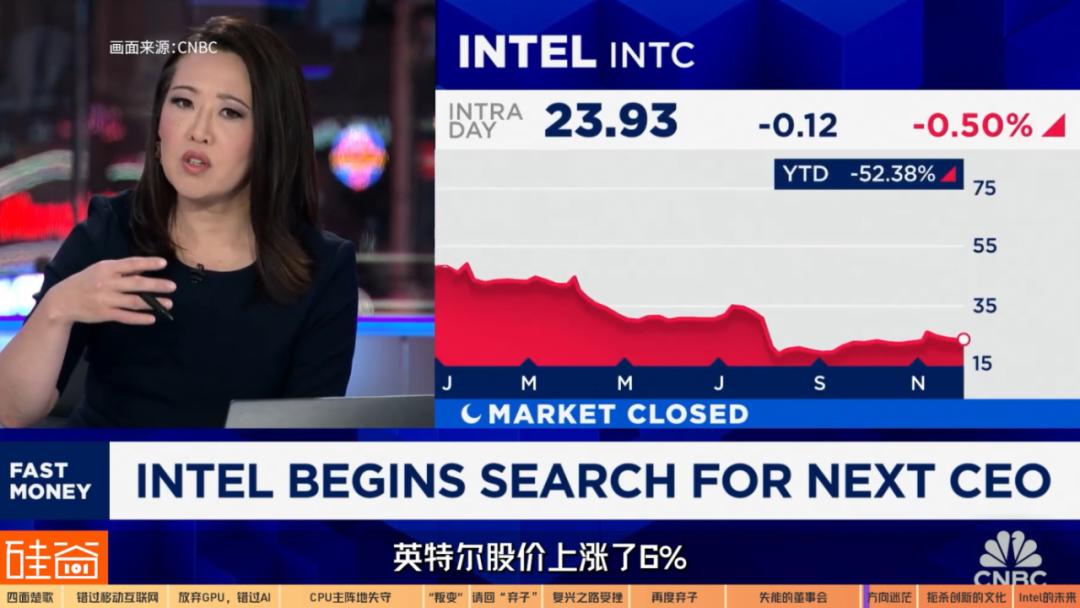 在董事会逐出Pat的第一时间,英特尔股价上涨了6%,但随后便是连续多日的下跌。