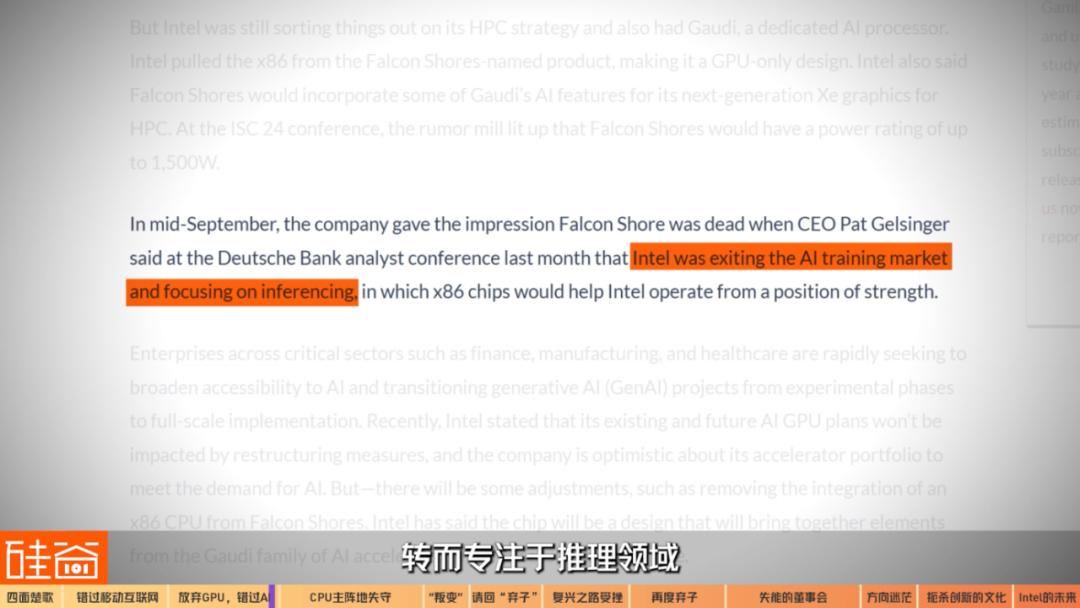 2024年9月中旬,Pat Gelsinger在德意志银行分析师会议上宣布,英特尔将退出人工智能训练市场,转而专注于推理领域,这也意味着英特尔开始退出部分AI市场。