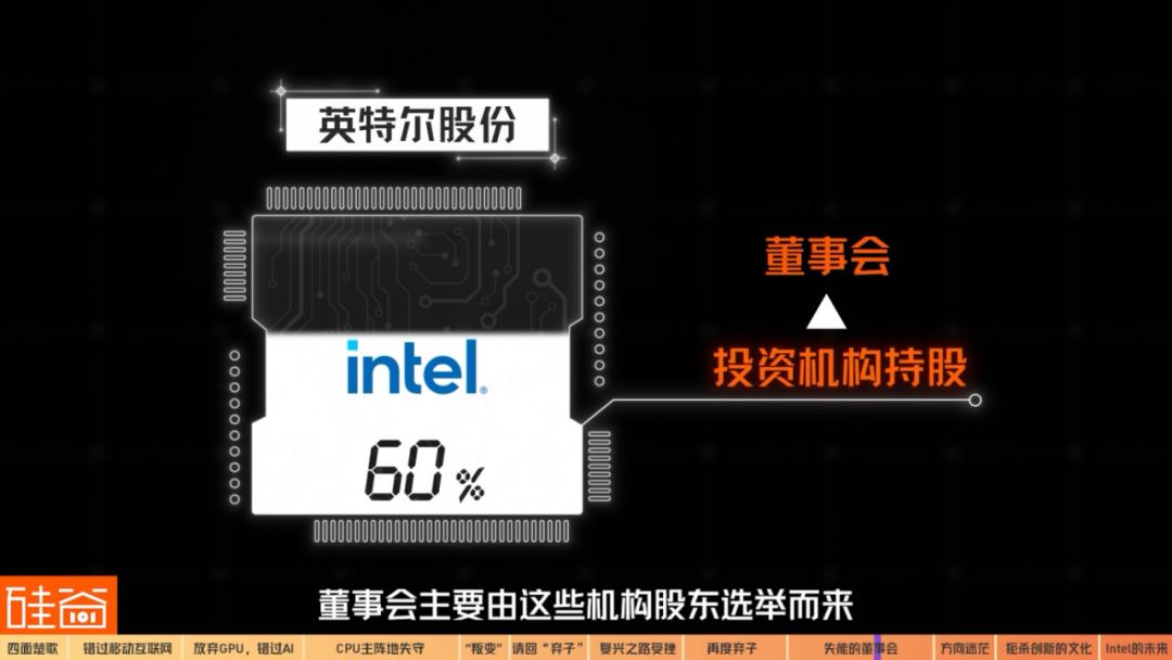 那么英特尔的董事会是如何形成的呢?董事由股东选举而来,根据公开数据,英特尔的股份超60%为投资机构持股,也就是说,董事会主要由这些机构股东选举而来。