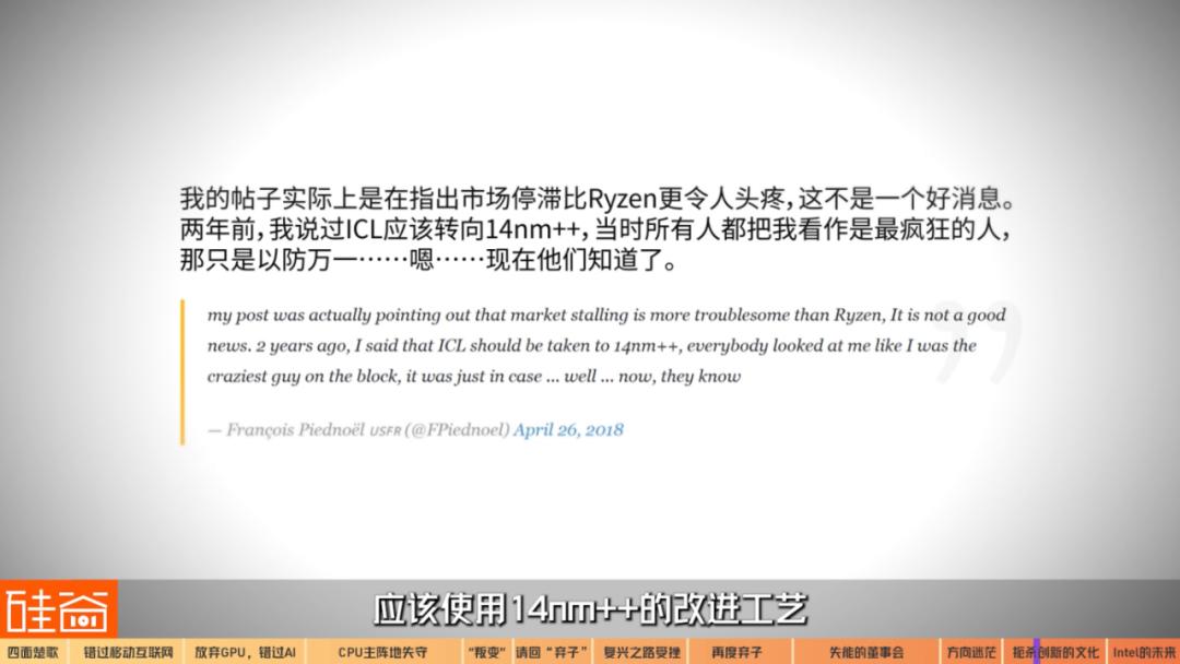 在制程技术陷入停滞的那几年,英特尔推出了14nm+和14nm++的改进工艺,英特尔前工程师2018年时发表推文说道,自己早在2年前就提出应该使用14nm++的改进工艺,但管理层并没有采纳他的意见,有猜测称,这是因为管理层对10nm的推进过于自信。