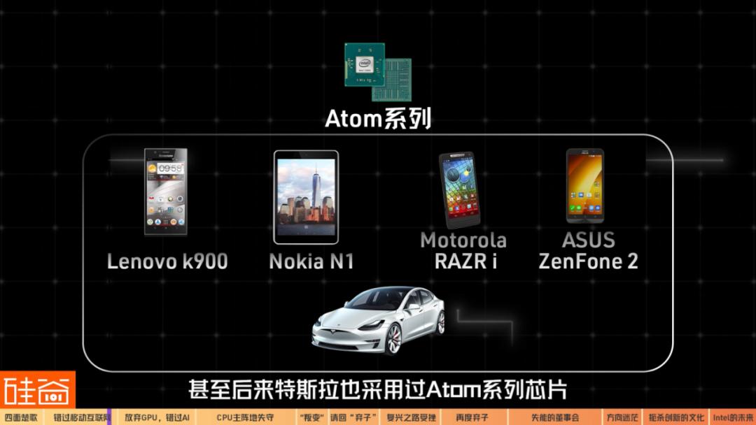 Atom起初是为小型上网本设计,但也用在了一些手机上,甚至后来特斯拉也采用过Atom系列芯片。