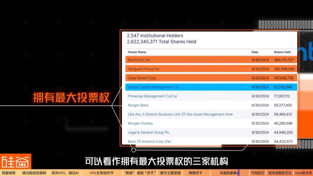 这三家机构,都属于被动投资者,而且排名第一的公司各位有没有觉得眼熟?我们前面介绍的英特尔董事会成员Barbara G. Novick,就是BlackRock的联合创始人。