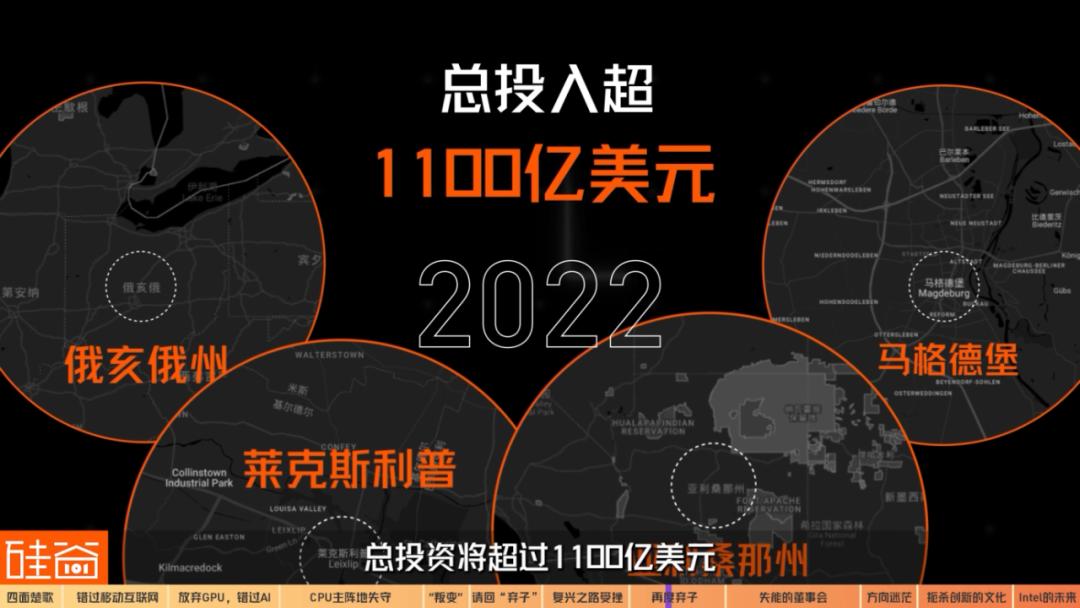 从2022年后,英特尔相继宣布了在美国俄亥俄州、德国马格德堡、爱尔兰莱克斯利普投资建厂,此外,还将花费300亿美元来扩大亚利桑那州的工厂,总投资将超过1100亿美元。