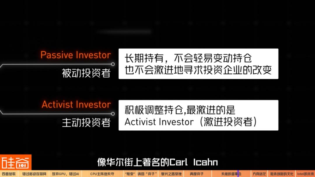 主动投资者会更积极调整持仓,其中里面最激进的是activist investor(激进投资者),像华尔街上著名的 Carl Icahn,被称为“野蛮人”,会收集股票成为大股东,从而激进的影响公司决策。