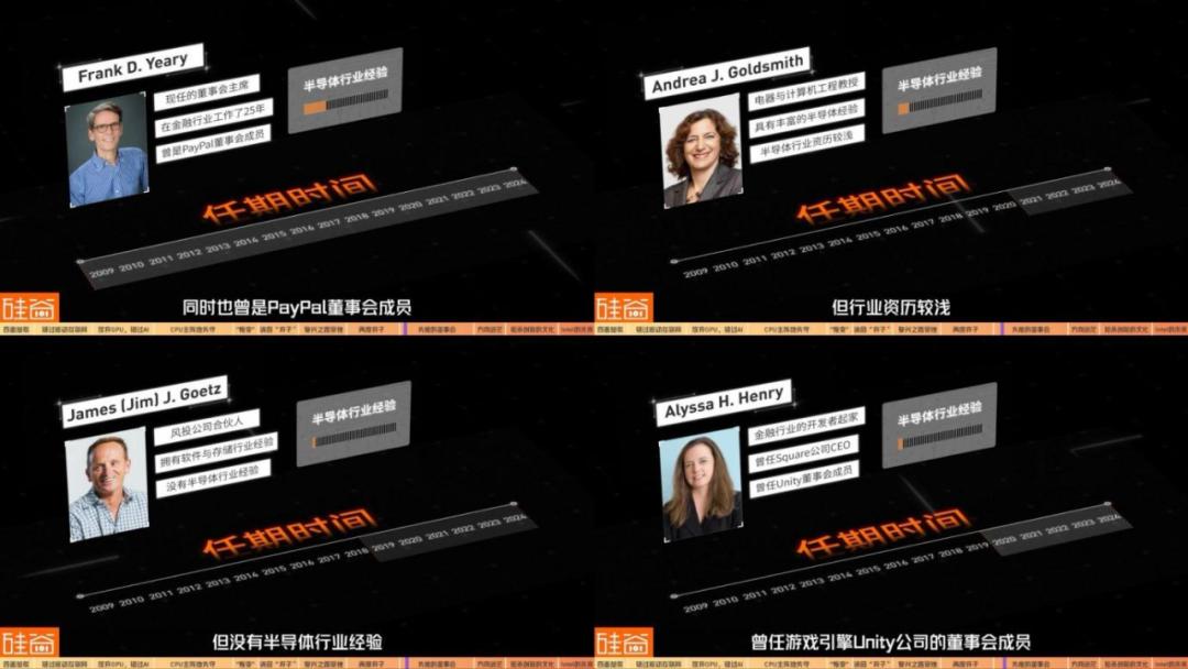 Frank D. Yeary:作为现任的董事会主席,也是在董事会任期最久的人,在金融行业工作了25年,几乎没有半导体行业经验,同时也曾是PayPal董事会成员。