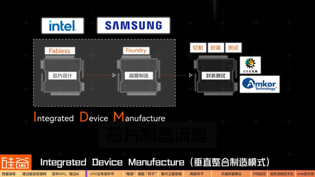 而英特尔与三星这样的公司能自己满足大部分流程,所以被称为IDM模式(,Integrated Device Manufacture),翻译过来是“垂直整合制造模式”。