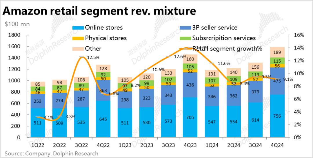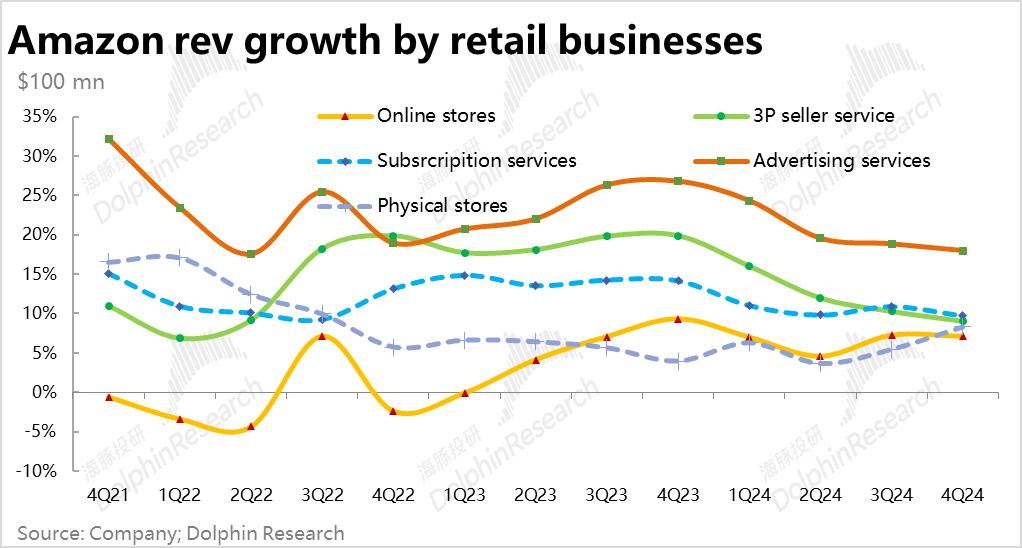 可见除了自营零售业务外,其他细分业务普遍呈现增长有所降速且跑输市场预期。因此尽管整体总营收约1878亿美元稍高于市场预期0.3%,看似不错,但3P服务和广告等高利润的业务却表现较差,结构上是比较差的。