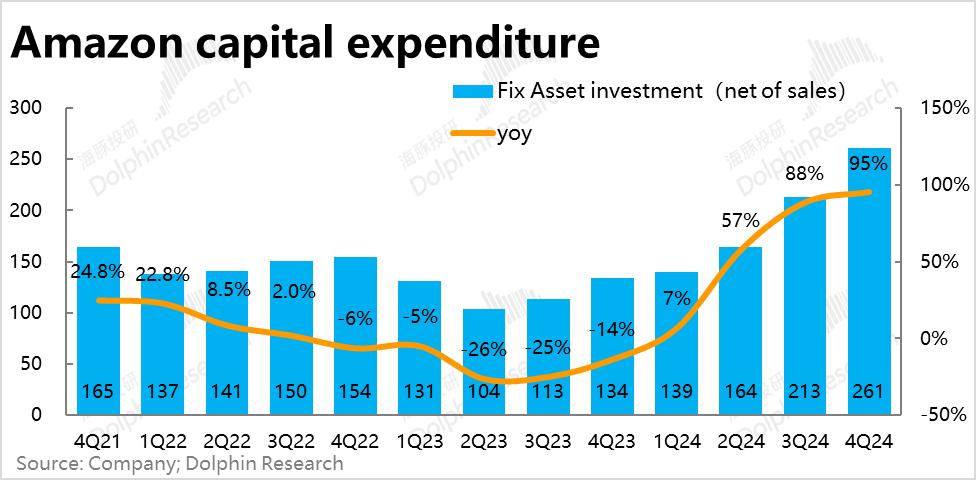 不过,本季度亚马逊的Capex大幅再度环比拉升了约50亿到276亿(这里是公司现金流量表中披露的口径,和电话会中口径有一些误差,但大体相同),同比增速继续拉高到了95%,无论是投入绝对值还算增长速度,都再创了新高。按电话会中的披露,2025年整体Capex支出应当会在1000亿以上。