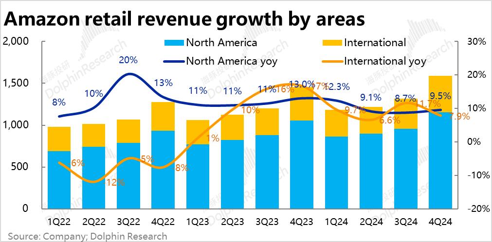2、 泛零售板块本季度的营收增速为9.1%,较上季度略微降速0.4pct,和市场预期一致。分地区表现,北美零售的增速实际从8.7%明显加速到9.5%,这和高频调研数据显示美国假期消费是比较强劲的情况一致。不过,本季国际零售业务的名义增速从11.7%大幅降速到了7.9%,在不变汇率下,国际地区的增速依旧环比下降了3pct。可见国际地区(可能主要是欧洲地区)的拖累,以及汇率负面的影响是零售板块增长略有走弱的主要原因。