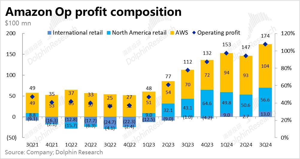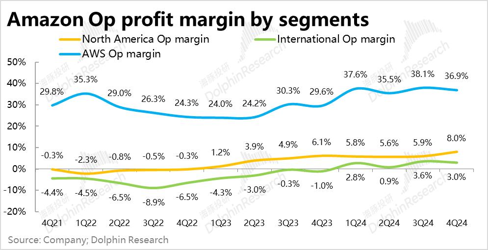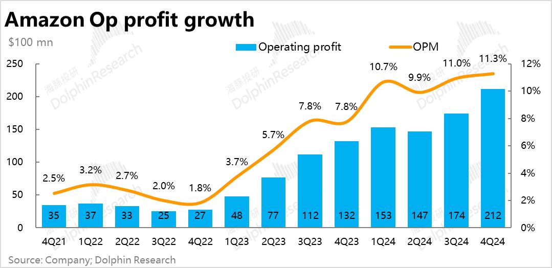 3、 本季亚马逊的利润依旧明显超出预期,整体经营利润达212亿美元,远超卖方预期的189亿,和先前指引上限的$200亿。据我们了解,买方期待的表现也只是$200亿以上,实际表现还是更好。整体经营利润率为11%,环比继续拉高了0.3pct。
