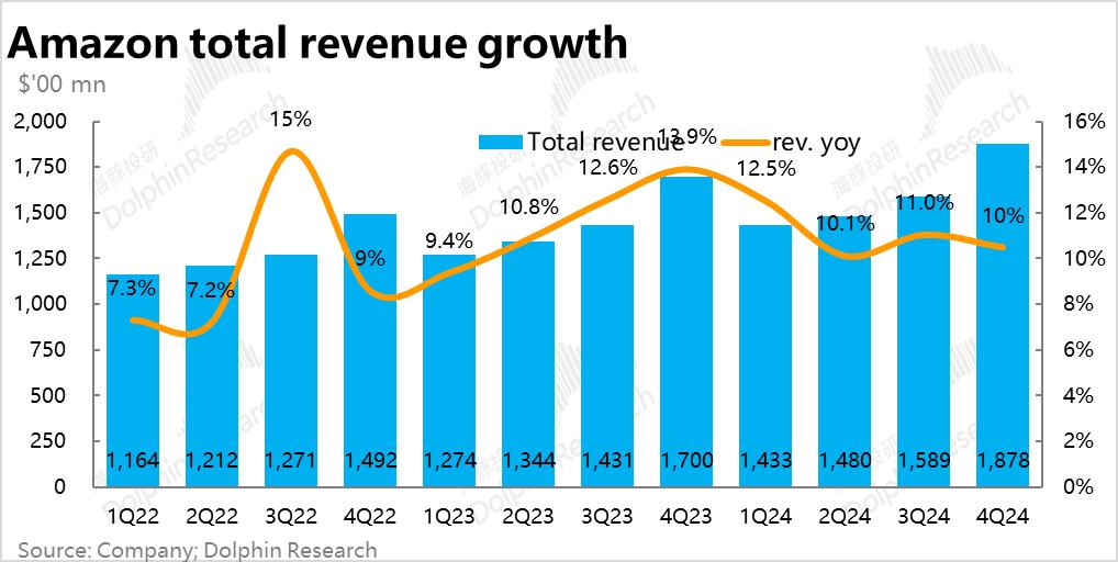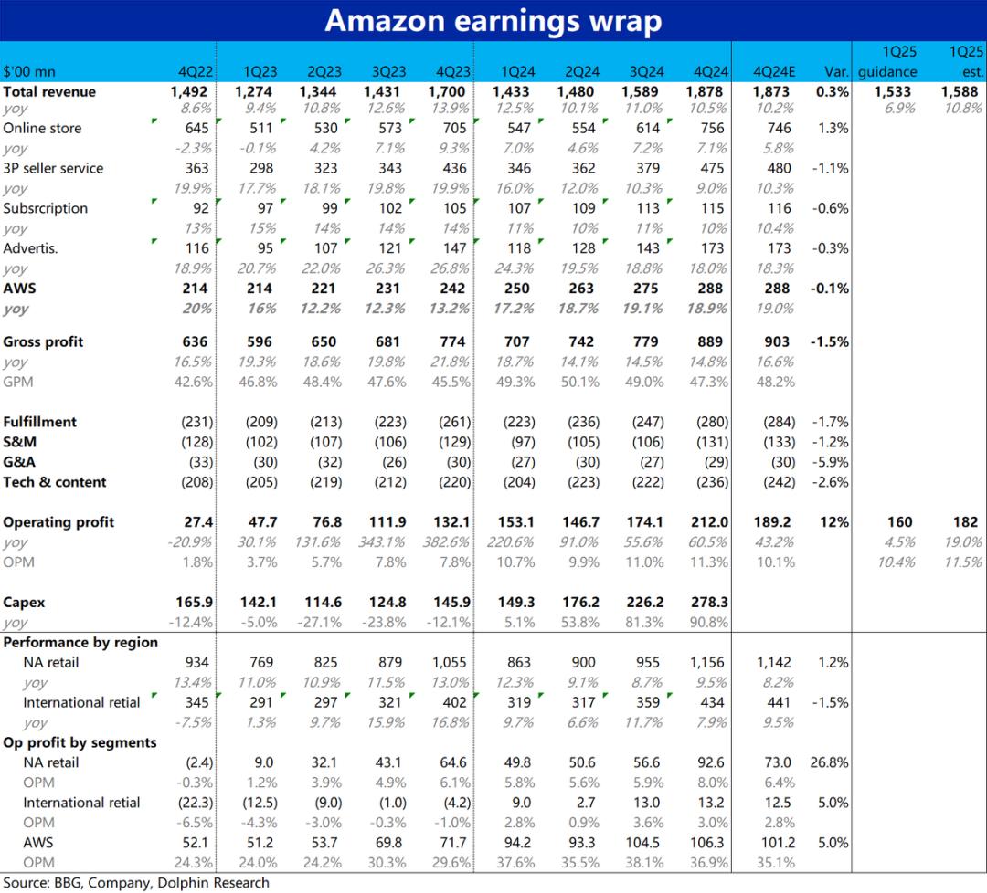 2月7日早美股盘后,亚马逊公布了2024年四季度财报,整体表现有亮点也有瑕疵,利润亮眼,但增长稍差。相对保守的指引和飞速拉高的Capex也是问题,具体来看: