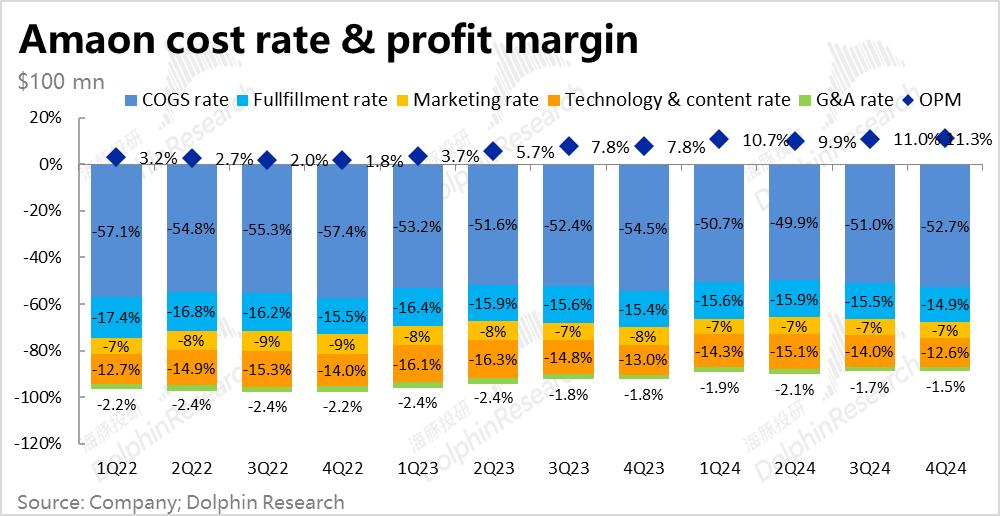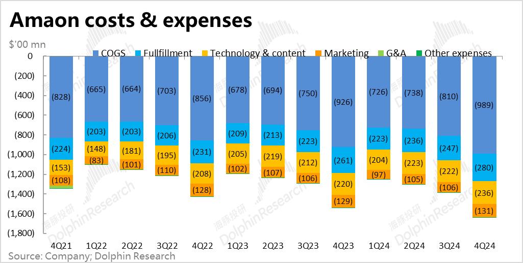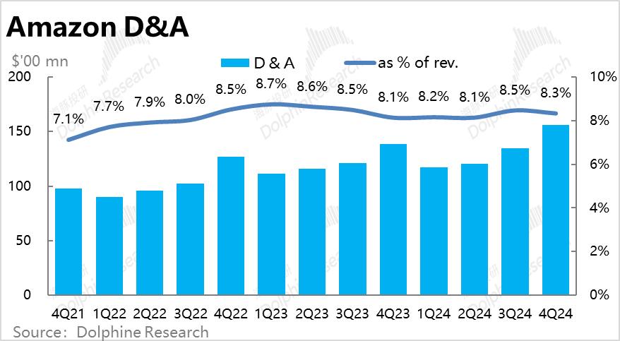 成本和费用的角度:1)本季的毛利率为47.3%,低于预期的48.2%。海豚投研认为,汇率的负面影响,Capex投入增长导致折旧上升,高利润的广告和3P业务相对增长更弱,都是毛利润率下滑的诱因。