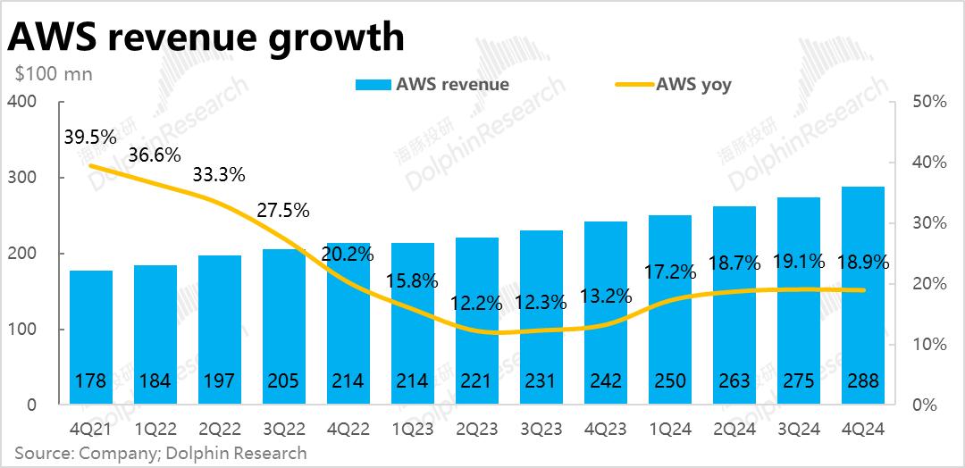 由于AI是当前毫无争议的市场投资主线,市场在公司各项业务之中,对AWS的表现尤为看重。本季AWS的营收同比增速为18.9%,相比上季放缓约0.2pct,也比卖方预期低0.1pct。不过据海豚投研了解,买方期待仍是20%或更高的增长。因此,AWS的增长显然是不尽人意的。
