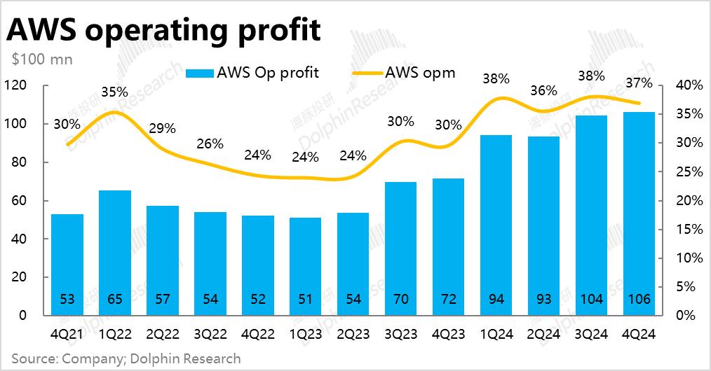 分板块看,前文已提及AWS云业务实际经营利润比预期高出约5亿,虽然利润率略有下滑,但相比预期要好些