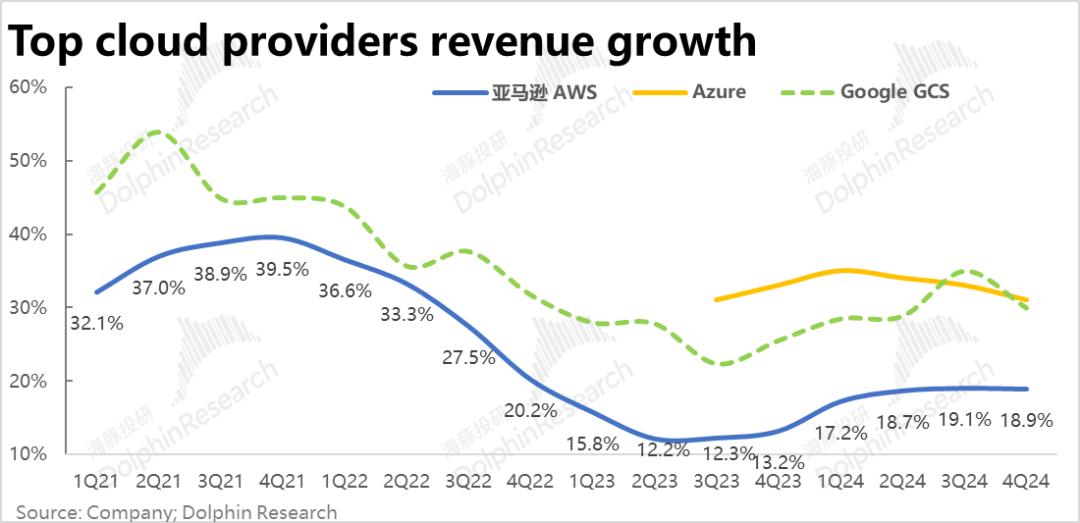 不过先前公布业绩的另两大云服务上,Azure和GCP本季的增长都双双明显减速,跑输市场预期,反映出云服务市场整体包括传统业务的需求并没有期待的那么强劲。当然单看AI相关需求,各家电话会中的表述普遍是需求很强,但受限于产能的供给不足。 因此,AWS此次同样跑输预期,并不算很意外。甚至可以说AWS相比另外两大云服务商的差距在“比差”的环境中,是缩窄了的。
