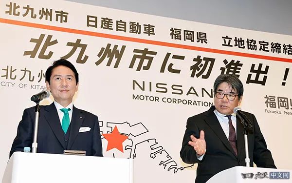 日产汽车副社长坂本秀行(右)在EV电池工厂选址签约仪式上回答记者提问(1月22日,北九州市)