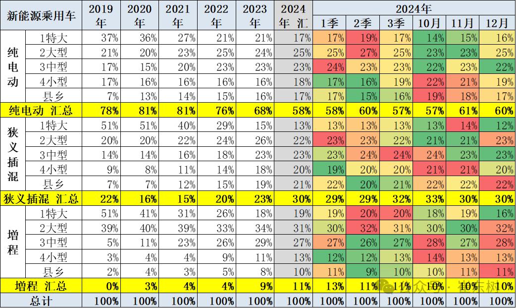 在油车还是电车的选项里,县城父老的抉择大抵也是如此。根据乘联会数据,2024年县乡纯电、插混、增程的销量比分别占全国销量的17%、21%、10%,比率仍有较大上升空间。