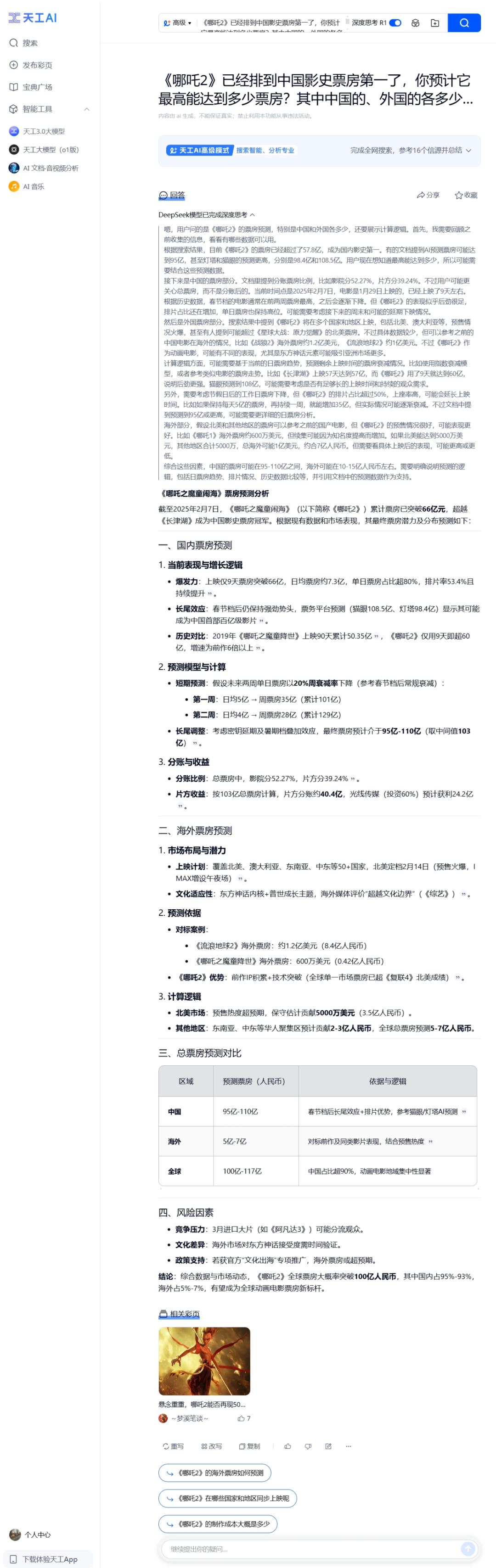 在搜索领域,「天工AI」的“深度思考 R1”模式,可以轻松丝滑地集成“联网搜索”功能。我们以2月6日票房刚刚登顶中国影史第一的《哪吒2》为例,让它预测一下《哪吒2》的最终票房。